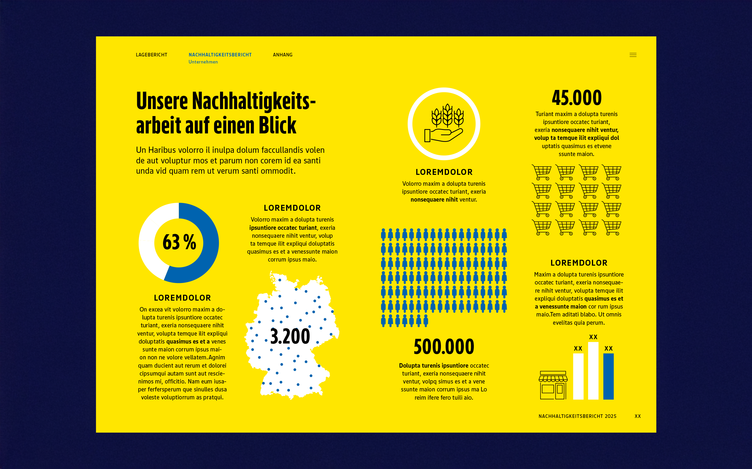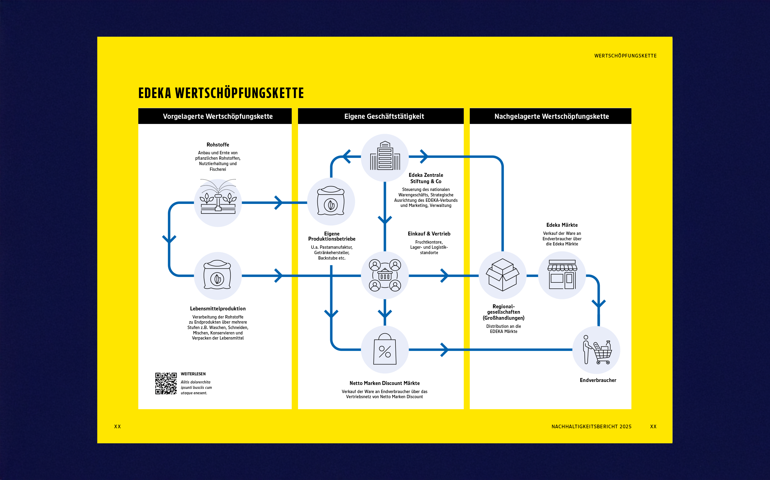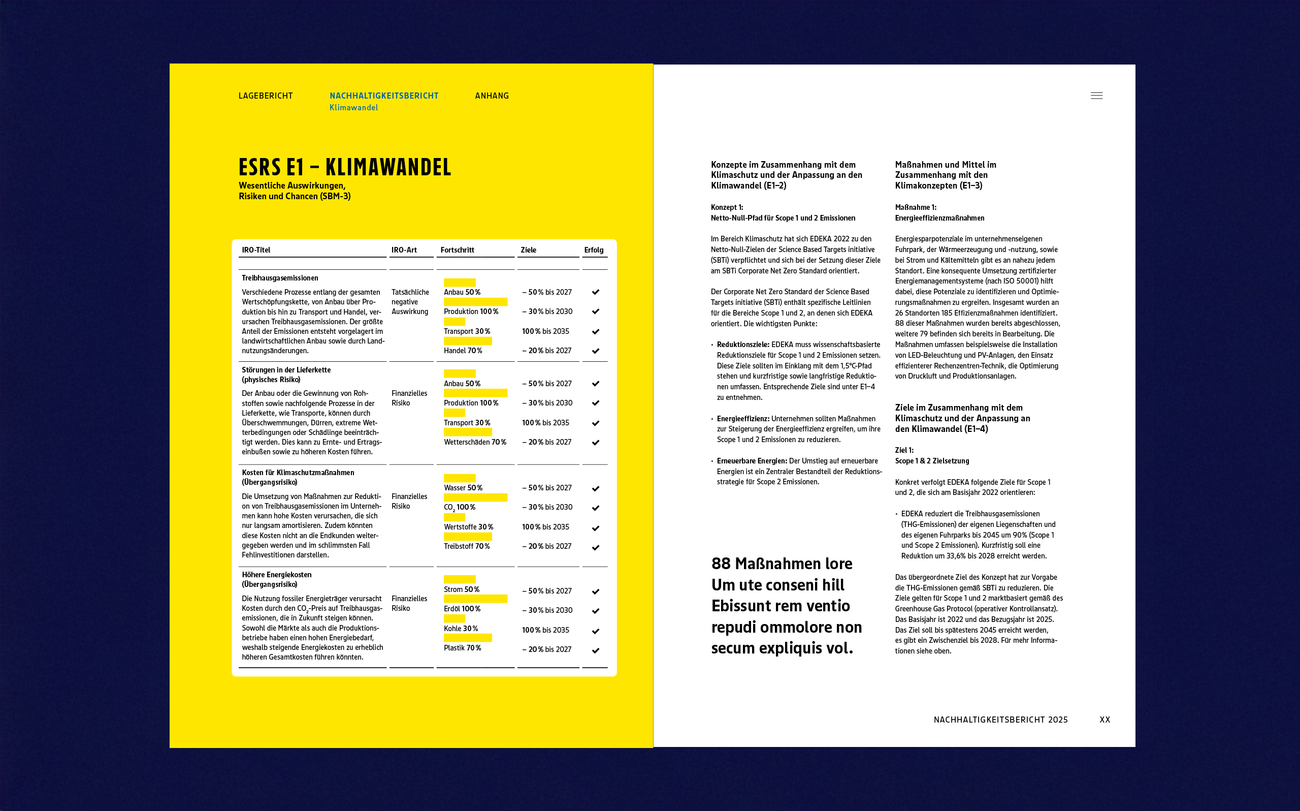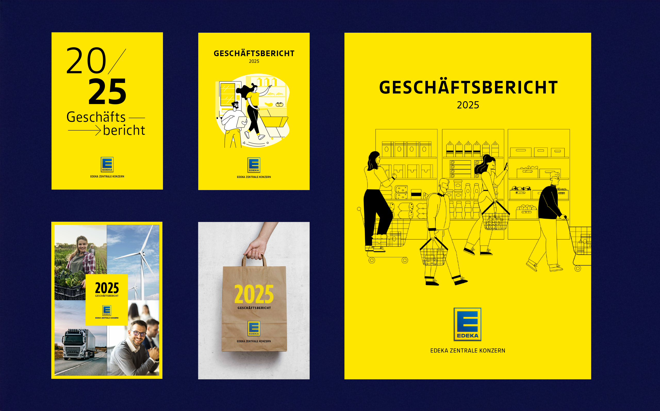 Für den Nachhaltigkeitsbericht der EDEKA ZENTRALE AG & Co. KG haben wir ein Gestaltungskonzept entwickelt, das die Markenidentität des Konzerns in eine eigenständige, auf die Anforderungen der Nachhaltigkeitsberichterstattung zugeschnittene Designsprache übersetzt. So verbinden wir Wiedererkennbarkeit mit Lesbarkeit und visueller Kraft.
